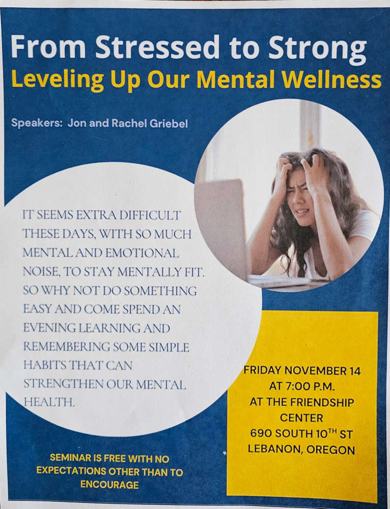 Friday November 14th at 7:00p.m. in our church gym, the 10th St Friendship Center, For an evening of learning and remembering some simple healthy habits that can strengthen our mental health during a seminar “From Stressed to Strong- Leveling Up Our Mental Wellness” presented by Pastor Jon and Rachel Griebel. Invite a friend!